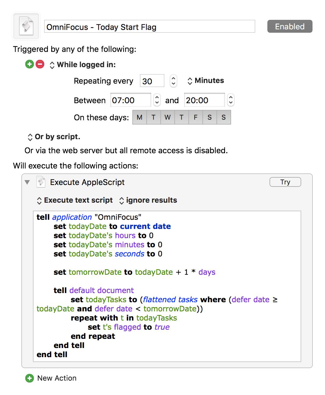 W moim przypadku uruchamia się on automatycznie co 30 minut pod warunkiem, że jestem zalogowany w systemie. Dzięki temu mogę dodawać zadania z dzisiejszą datą w polu Defer Date przy użyciu funkcji Quick Entry. Skrypt daje mi pewność, że nie dalej jak za 30 minut zostaną one oflagowane i wyświetlone w odpowiedniej perspektywie. Ja zaoszczędzam sobie w ten sposób jeden krok mniej w postaci oflagowania zadania przy użyciu skrótu klawiaturowego.