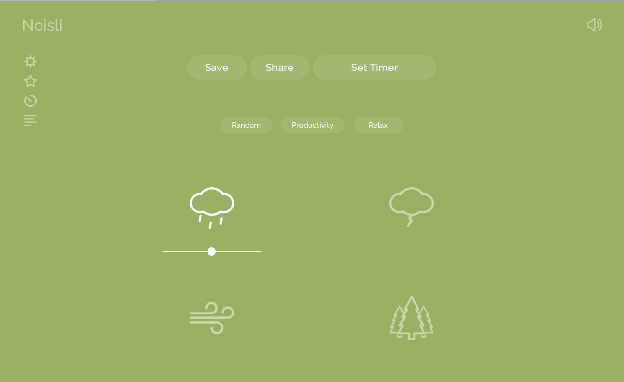 Postanowiłem, że czas tą niewiedzę zmienić w świadomość. Jako, że żadna kawiarnia nie jest mi aktualnie po drodze, nie umiem wywoływać deszczu, a pociągi są zbyt daleko od miejsca mojego zamieszkania postanowiłem stworzyć sobie odpowiednie warunki w domowym zaciszu. Istnieje sporo aplikacji, które to umożliwiają, jednak najbardziej spobała mi się strona internetowa Noisli.