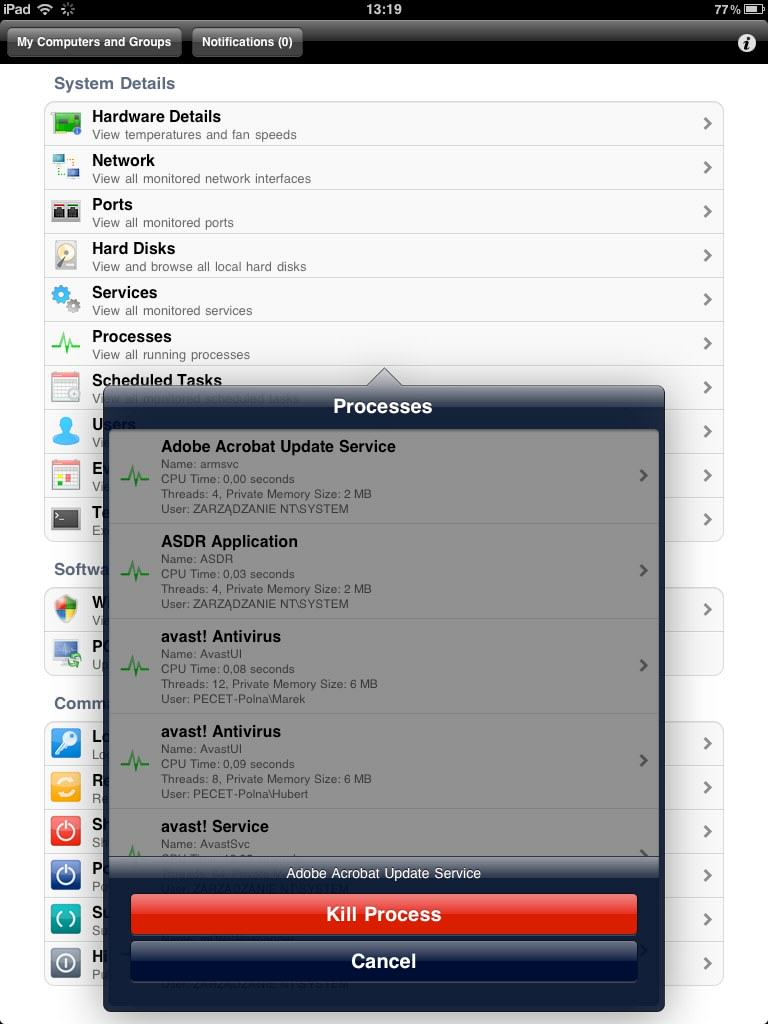- podgląd uruchomionych usług i procesów z możliwością ich wyłączenia