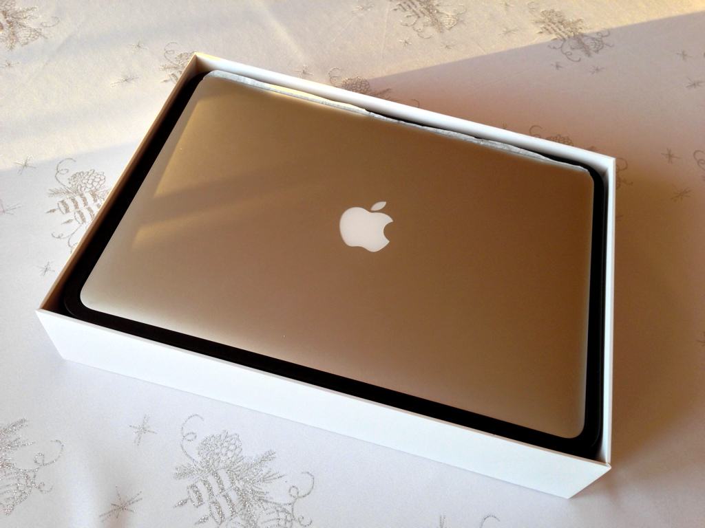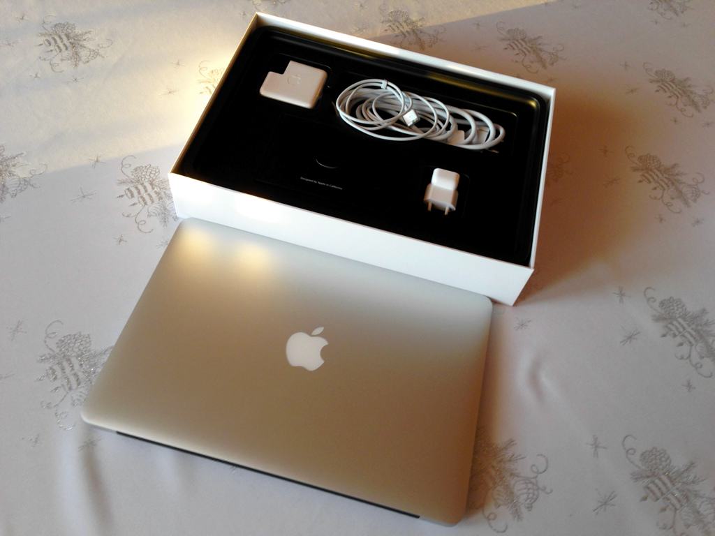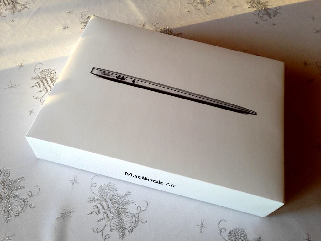Komputer został zamówiony 28 lutego i dotarł w dniu dzisiejszym (prezent w sam raz na… dzień chłopaka), mimo że Apple rozsądnie i z zapasem podawało termin dostawy na 12 marca. Jako, że MacBook Air to konstrukcja bardzo zamknięta, namówiłem Sławka do wyboru wersji z rozszerzoną do maksimum pamięcią RAM – 8 GB, oraz większym niż standardowy dyskiem twardym Flash – 256 GB. Wybór matrycy (13″) zdawał się oczywisty. Niestety, i tak już dość mocno nadwyrężony budżet nie pozwolił na zmianę procesora, ale standardowy dwurdzeniowy Intel Core i5 1,3 GHz z Turbo Boost do 2,6 GHz i tak robi świetną robotę, o czym niżej.