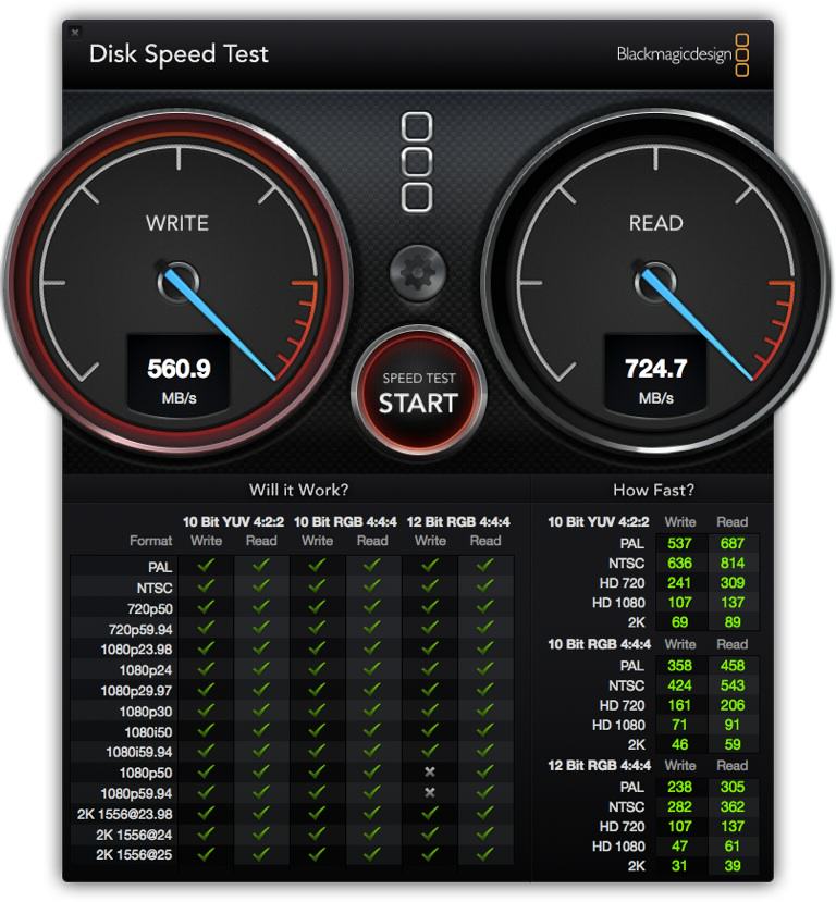 Po skonfigurowaniu konta użytkownika, oraz wszelakich usług (zajęło to trochę…) postanowiłem przeprowadzić pierwsze testy. O dziwo komputer przyjechał z OS X 10.9! Jako, że aktualizacje miały zająć trochę czasu, testy wykonałem na tej właśnie wersji systemu. Na pierwszy ogień poszło badanie dysku aplikacją znaną chyba większości z Was, czyli BlackMagic Disk Speed Test, oto wynik: