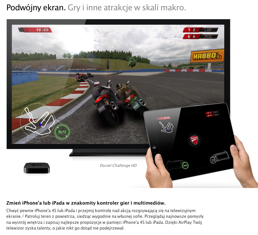 Sam (samo?) Apple nawet na swoich stronach zachęca i reklamuje aTV jako przystawkę zajmującą się wyświetleniem obrazu na ekranie telewizora pozwalając w ten sposób zredukować zadania stojące przed iUrządzeniami a konkretnie iPadem 2 generacji, Nowym iPadem oraz iPhone 4S do sterowania grą. I tu jest sedno sprawy! Bo o ile możemy przyjąć, że pewnie z 99% ekranów aplikacji i gier uda się wyświetlić na TV dzięki funkcji klonowania obrazu to korzyść z tego rozwiązania – poza chęcią zademonstrowania szerszej publiczności naszych manualnych czy strategicznych umiejętności – jest niewielka… Inaczej mówiąc, gdy mamy identyczny obraz na ekranie iPada lub iPhone oraz telewizora – tele-jabłko działa mniej więcej jak „bezprzewodowy przewód” :D tyle, że droższy od dostępnych w sklepie Apple rozwiązań: przejściówka cyfrowego AV, kabel zespolonego AV lub przejściówka VGA. Fajny… ale tylko bajer.