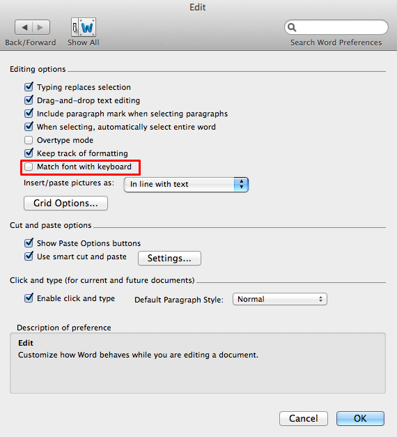 Nasz winowajca znajduje się dokłądnie tutaj. Jest to opcja Dopasuj czcionkę do klawiatury (Match font with keyboard). Pozycja ta powinna być odznaczona: